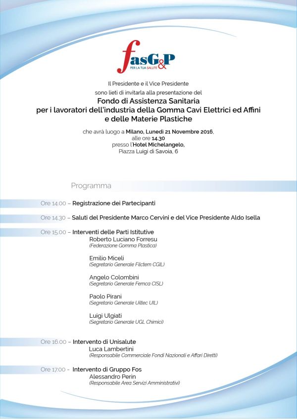 FasG&P, Fondo di assistenza sanitaria integrativa per il settore dell'industria della gomma cavi elettrici ed affini e dell'industria delle materie plastiche, organizza, il pomeriggio di Lunedì 21 Novembre p.v a Milano, la presentazione del Fondo.