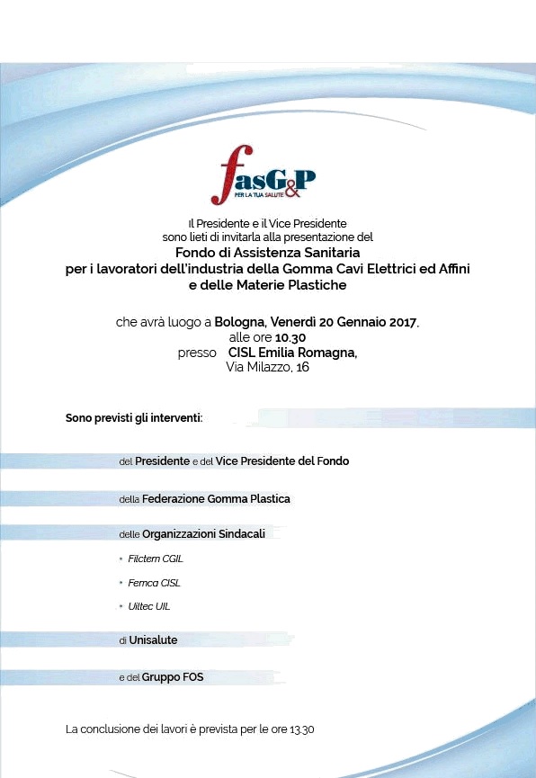 FasG&P, Fondo di assistenza sanitaria integrativa per il settore dell'industria della gomma cavi elettrici ed affini e dell'industria delle materie plastiche, organizza, Venerdì 20 Gennaio p.v. alle ore 10.30 a Bologna, la presentazione del Fondo.