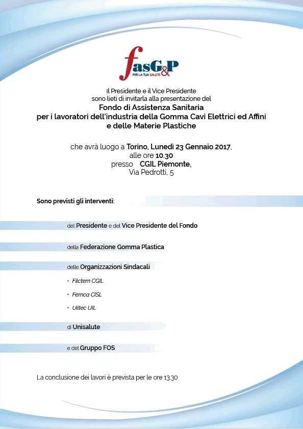 FasG&P, Fondo di assistenza sanitaria integrativa per il settore dell'industria della gomma cavi elettrici ed affini e dell'industria delle materie plastiche, organizza, lunedì 23 Gennaio p.v. alle ore 10.30 a Torino, la presentazione del Fondo.